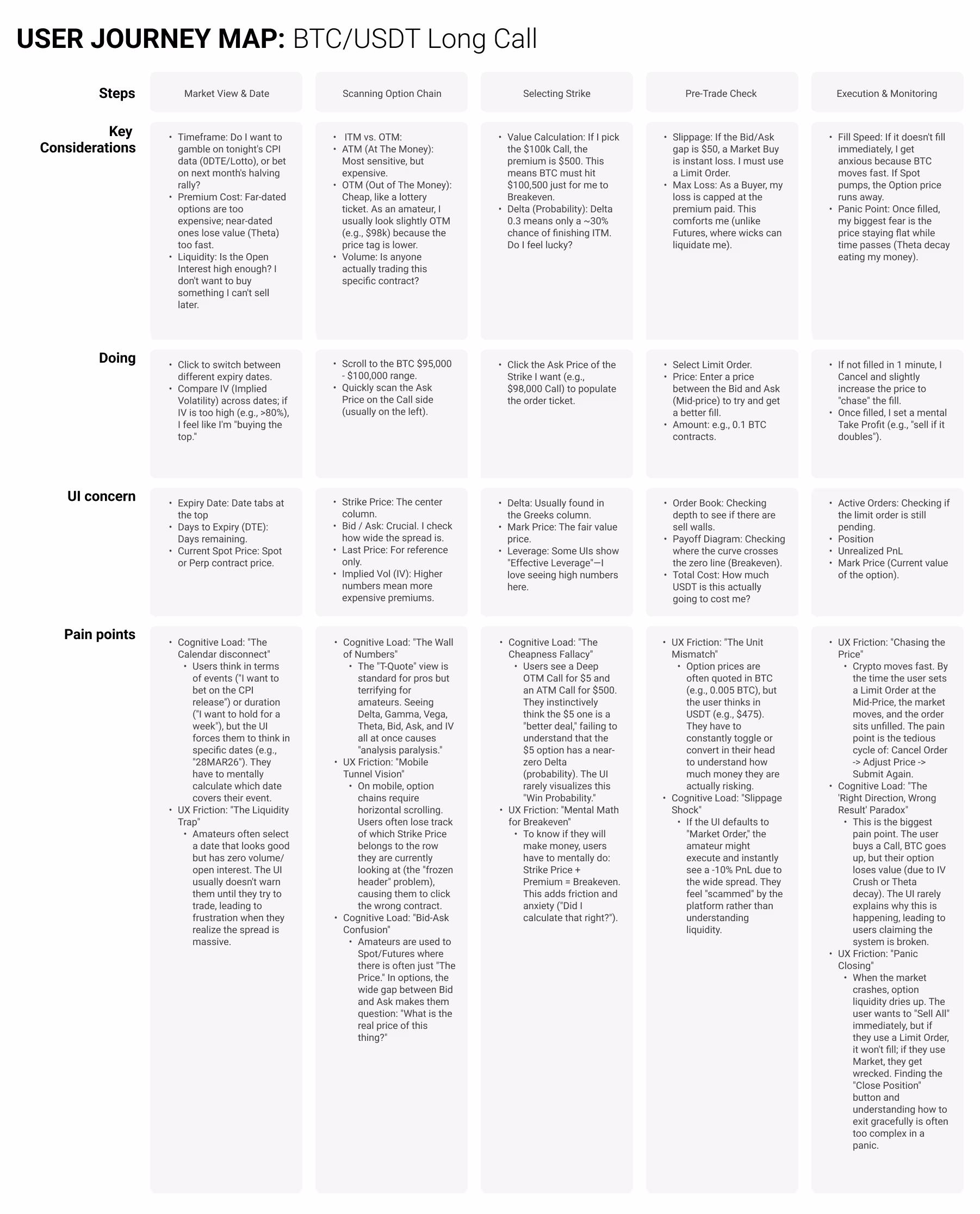 Heavy early reliance on competitors for structure and flows. To ground it in real use cases, I drafted a simple options trading scenario via quick online research and informal chats with Crypto.com PMs (many with advanced trading experience), guiding minor refinements.